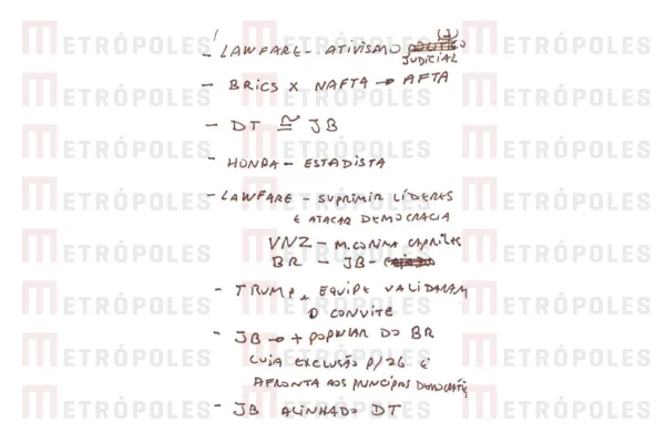 Os papéis, encontrados sobre a mesa de Bolsonaro na sede do PL, em Brasília, trazem expressões como “DT e JB” (iniciais de Trump e Bolsonaro), “Trump e equipe validaram o convite”, “JB alinhado DT” e “JB — Trump — Último”.
