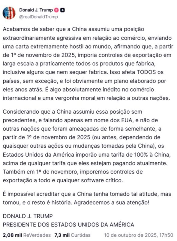 “Acabamos de saber que a China assumiu uma posição extraordinariamente agressiva em relação ao comércio, enviando uma carta extremamente hostil ao mundo, afirmando que, a partir de 1º de novembro de 2025, imporia controles de exportação em larga escala a praticamente todos os produtos que fabrica, inclusive alguns que nem sequer fabrica. Isso afeta TODOS os países, sem exceção, e foi obviamente um plano elaborado por eles anos atrás. É algo absolutamente inédito no comércio internacional e uma vergonha moral em relação a outras nações”, escreveu Trump na Truth Social.O líder norte-americano afirmou que os Estados Unidos adotarão uma postura igualmente dura. “A partir de 1º de novembro de 2025 (ou antes, dependendo das ações da China), os Estados Unidos imporão uma tarifa de 100% à China, acima de qualquer tarifa que eles estejam pagando atualmente”, declarou. Trump também anunciou que o país passará a impor controles de exportação sobre “todo e qualquer software crítico” produzido em território americano.